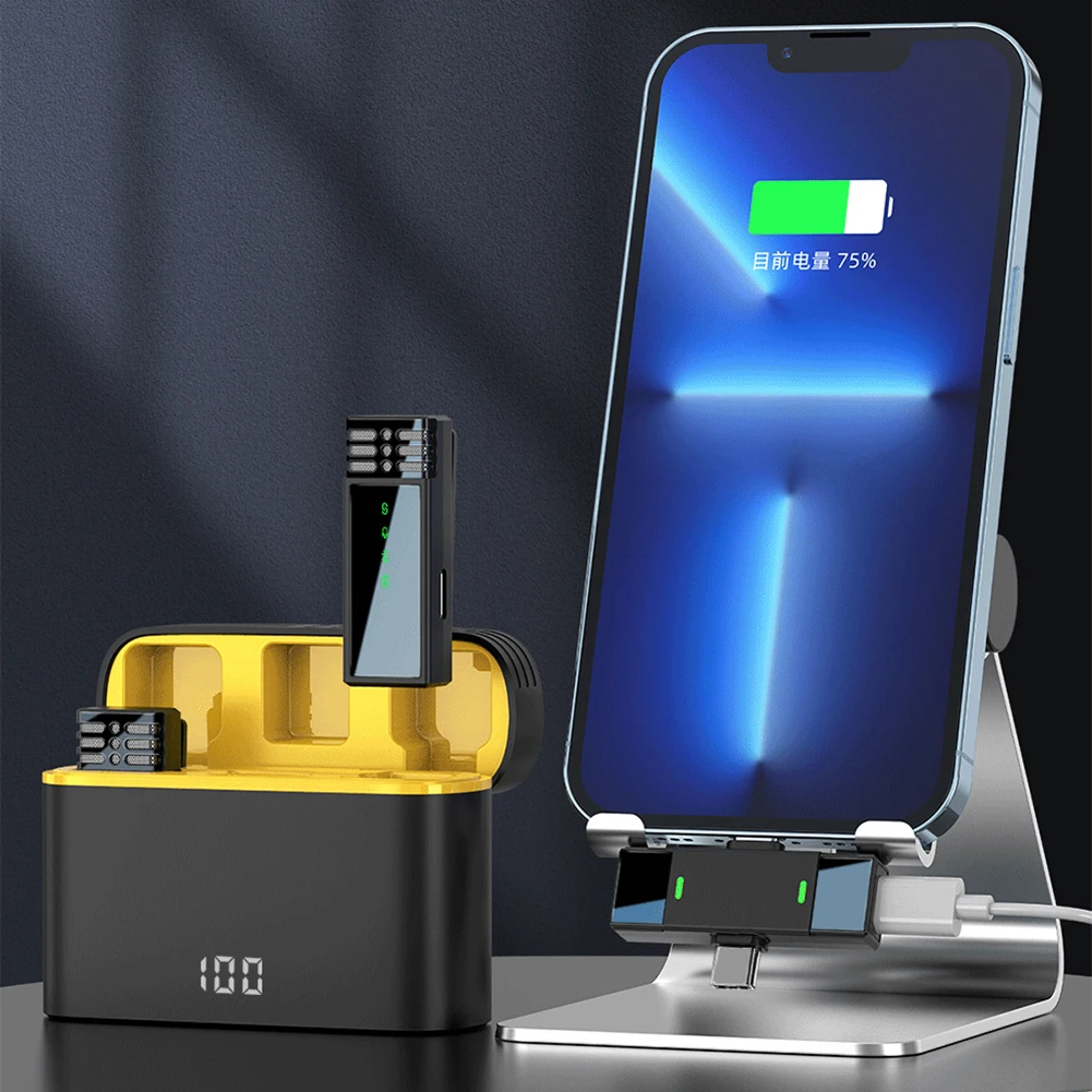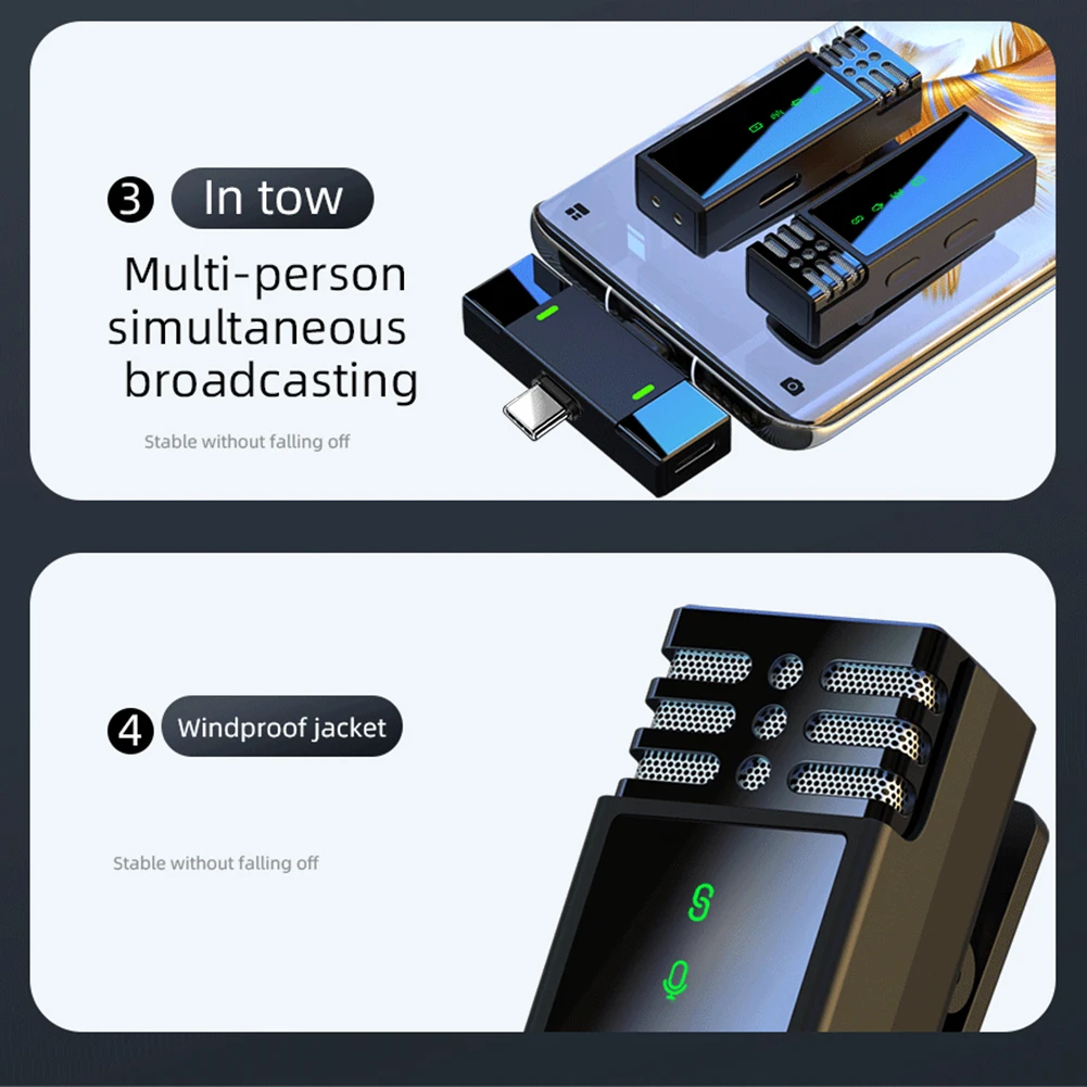 This product is a smart wireless microphone that provides professional-level recording output. Plug and play, no APP required. Multiple uses: It can be used in online live broadcast, video Vlog shooting, program interviews, interview recordings, video teaching and other occasions.